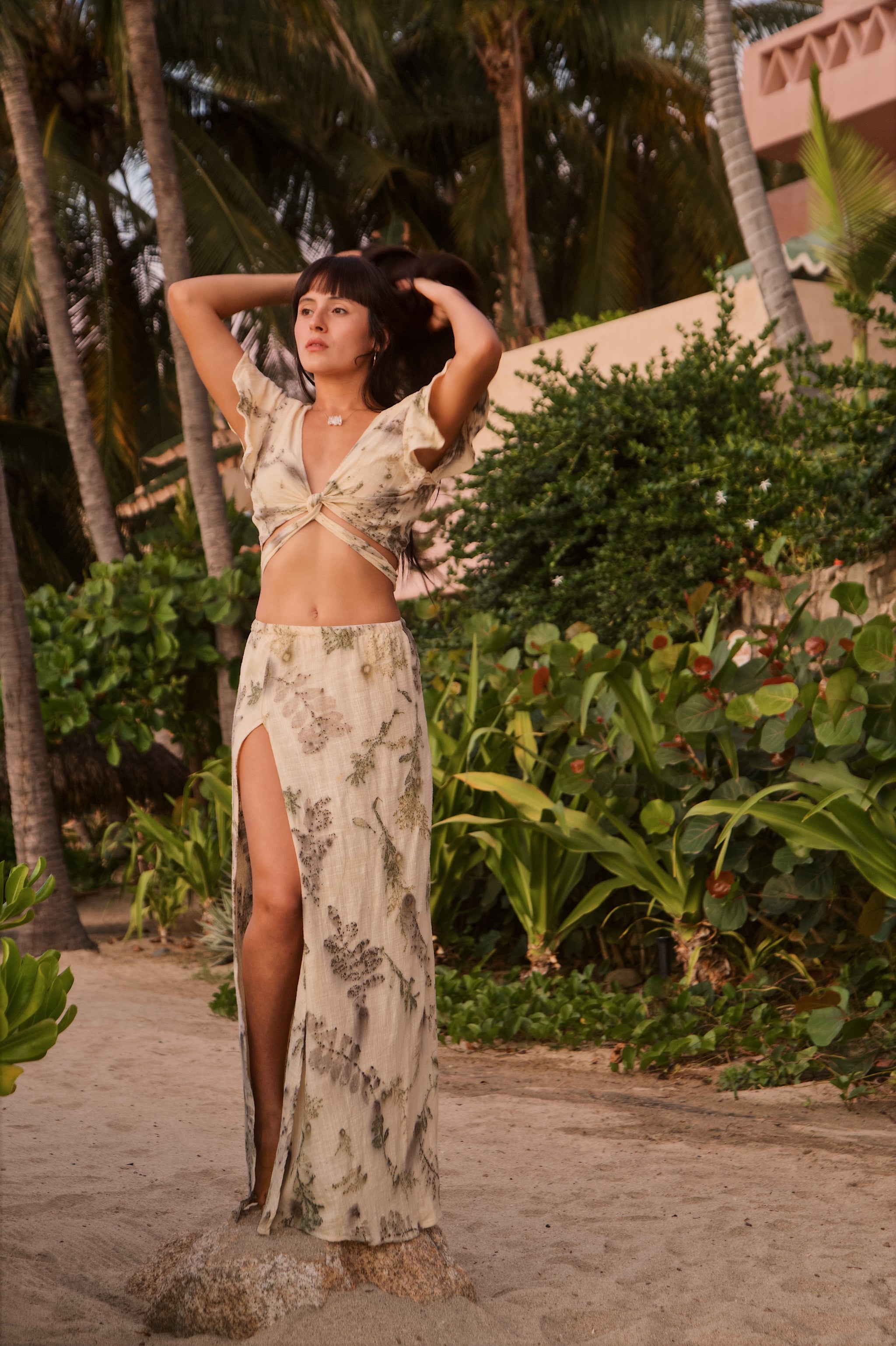 A sensual, grounded set crafted from 100% cotton. The long skirt features a high slit, paired with a matching top that enhances the feminine silhouette.